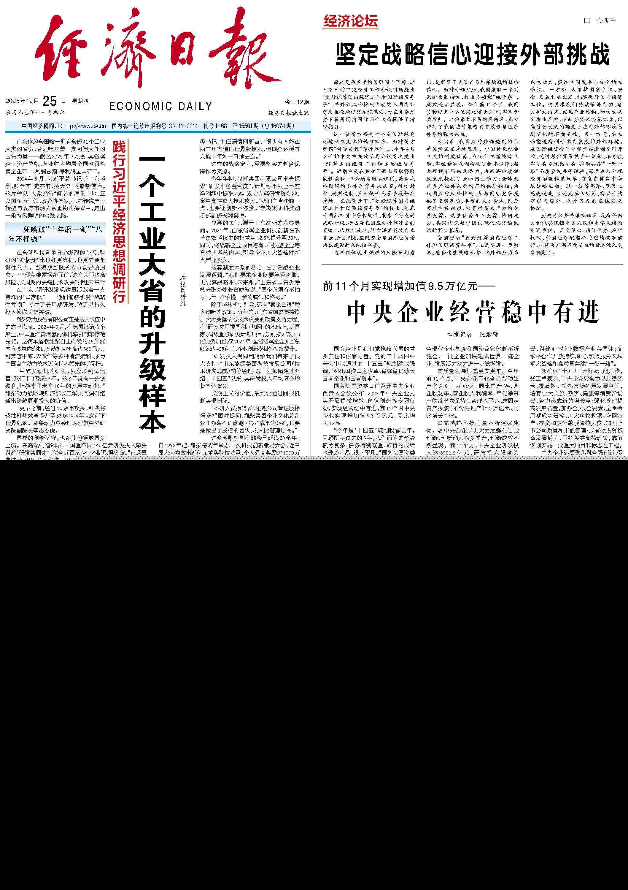 山东能源集团新能源集团有限公司在渤中A、B投资建设两个90万千瓦海上风电场,到2022年12月底,项目将实现满负荷并网发电。龚振普 摄(中国经济视野) 青岛胶州湾大桥由山东高速集团投资建设。 (资料图)山东作为全国唯一拥有全部41个主要工业门类的省份,背后有可以承担重要责任的国有力量。截至2025年9月末,省属企业资产总额和营业收入在全国省级规管企业中排名第一,收入总额和净利润排名全国第二。 2024年5月,习近平总书记视察山东,赋予他“带头先锋”新使命。这片曾经被称为“大象经济”的巨大土地上,是国有企业和龙头企业。政府与企业共同努力,在探索传统产业改造、重建政府与市场关系方面探索出了一条独特的实践路径。为什么敢于“十年磨一剑”、“八年不赚钱”?在全球科技竞争日益激烈的今天,科研“冷板凳”比以往任何时候都更加困难,而能坐上它的人则更加必要。当短期回报成为市场的共同愿望时,一个现实的问题摆在面前:谁来“投资未来”进行高风险、长期的基础技术研究?在山东,研究团队认为,这里活跃着一支特殊的“国家队”——他们能承受“战略损失”,专注长期研发,敢于用长期投入换取重大成果。潍柴动力股份有限公司是这一群体的独特代表。 2024年9月,在汉诺威德国车展上,中国重汽黄河氢内燃机牵引列车惊艳亮相。该车搭载潍柴自主研发的15升缸内直喷氢气内燃机。发动机功率高达560马力,兼容甲醇、天然气等多种清洁燃料。成为中国自主动力技术领先世界的新标杆。 “甲醇设备的研发,从立项到试运行,我们已经用了八年时间。这八年我们没有赚到一分钱,但我们已经掌握了未来十年的发展主动权。”潍柴动力战略规划部部长王华杰向调研团队讲述了周期投资的价值。 “此前,潍柴经过10多年的研究,将柴油机热效率提高到53.09%,刷新了世界纪录。“四年四次订单。”潍柴动力总经理助理、中央研究院副院长李志杰说。同样的坚持创新也发生在其他领域。在高端制造领域,中国重汽率先成立“研发共同体”,研发投入达140亿元,汇聚近百家企业,不断取得成功。“市场虽变,研发不能停下来。国企的作用就是在不确定性中提供确定性。”中国重汽集团党委副书记蒋芃芃热情地表示。这些企业的实践共同勾勒出山东国企的创新群体:有的向“天”发展算力和大模型,有的向“地”开采矿山、能源,有的向“海”发展氢能源和运输设备。正如时任山东省国资委党委书记、主任满申刚所说:“两三年内能创造出世界一流技术的人很少,但十年内能创造出世界一流技术的国有企业一定有人。”犹如一日创造。 “这样的战略决心需要强有力的制度保障作为支撑。今年年初,浪潮集团有限公司已率先探索‘研发储备制度’,计划每年提取上一年净利润的20%设立专属研发资金池,集中支持重大技术突破,但我们也更愿意保留较小的突破。”浪潮集团科技创新部副部长魏雷表示。浪潮的底气来自于山东清晰的考核导向。 2024年,科技权重山东省属企业创新改革绩效考核比例由12.5%提高到33%。同时,产业项目也是新业务。将科技型企业培育纳入考核内容,引导企业加大对战略性新兴产业的投入。这一制度体系的核心是业务发展逻辑的重塑。 “我们要求企业不仅要算经济账,还要算战略账、未来账。”山东省国资委考核分配处处长董晓波表示,“国有企业要有底气、有格局,不怕几年后赔钱,也不怕慢。”除了考核机制的引导,还有政策“真金白银”上来帮助企业变革。近年来,山东省国资委国资委稳步加大对基础技术研究的政策支持。在“研发费用视同加回收入”的基础上,山东省国资委拨付山东省国资委研发项目。分别按2倍和1.5倍的比例加回。仅2024年,全省省属企业增加值总额就将达到428亿元。企业创新热情不断高涨。 “研发投入算利润,给我们带来了很大的支持。”山东能源集团科技开发公司(通用技术研究院)副总经理、总工程师隋建才表示,“十四五”以来,研发投入年均复合增长率达25%,长期主义的价值凸显最终通过返回机制实现闭环。 “到底是科研人员挣得更多,还是公司管理者挣得更多?”面对提问,潍柴集团企业文化总监张正强毫不犹豫地回答:“论成绩,英雄,只要团队取得成绩,利润就比管理层高。” “这种激励机制在潍柴已经持续了20多年。自1998年起,潍柴每两年召开一次科技奖励大会。近三届大会,奖励科技英雄人物近亿元,个人最高奖励达1000万元'9,潍柴2亿元以内。机器可靠性国家重点实验室学术带头人济源获此殊荣。其他企业也有自己的激励机制——浪潮集团建立了一支由技术管理人员和技术人员组成的专业人才队伍。规定对科技成果做出重要贡献的人员给予一定的奖励和补偿;东方高速集团成立了四家科技转化公司,推动技术运营产业化;山东能源集团实施“放权放管+中长期激励”改革,探索股权激励等机制……从单个项目的“科研回报”到系统性的“创新效益”,山东国企的长期主义正在形成良性循环。创新不再只是投资的消耗,而是成为企业可持续增长的内在动力。正如山东省国资委科技创新处处长王明华所言,科技的好处逻辑创新不仅体现在账本收入上,更能带动整个行业的生产。地位的飞跃。这种制度刚性正在塑造一种“不以一时得失论英雄,以十年磨一剑论责任”的新企业文化。 “